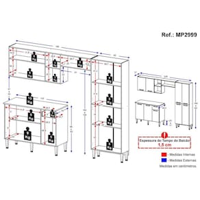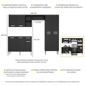 Cozinha: Altura: 184cm | Largura: 228cm | Profundidade: 27cm (aéreos e paneleiro) - 44,5cm (balcão com tampo)