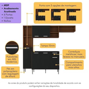 Especificações Técnicas: Dimensões do Produto Montado: Altura: 181 a 184cm | Largura: 181cm | Profundidade: 45cm (Balcão) - 25cm (Aéreos) Espaço para Fogão/Geladeira: Altura: 159 a 162cm | Largura: 61cm Material: MDP proveniente de reflorestamento Quantidade de Portas: 6 Quantidade de Gavetas: 1 Corrediças: Metálicas Compatível com Pia: Não Tampo Incluso: Sim