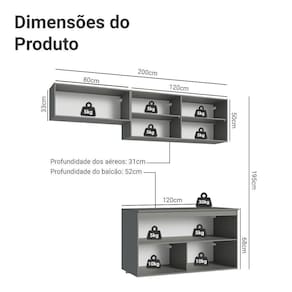 Dimensões: 195 cm altura x 200 cm largura x 52 cm profundidade