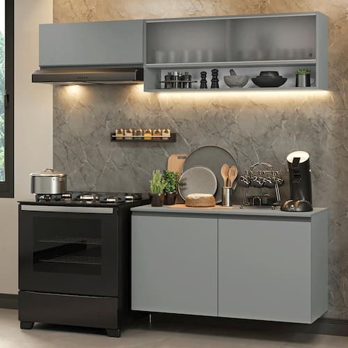 O espaço interno e externo do móvel é ótimo para louças, panelas, utensílios e eletroportáteis. Além disso, o formato suspenso facilita a limpeza e deixa a cozinha ainda mais estilosa.