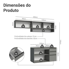 Dimensões: 195 cm altura x 200 cm largura x 52 cm profundidade
