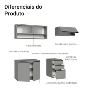 Conta com puxadores em alumínio, corrediças telescópicas para abertura total das gavetas e dobradiças metálicas nas portas