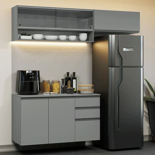 Por ser suspenso, este modelo facilita a limpeza e deixa sua cozinha ainda mais charmosa. E o acabamento cinza de alta resistência conserva a beleza do móvel por mais tempo.