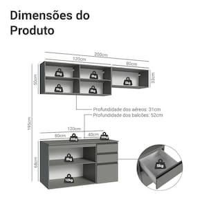 52 cm de profundidade nos balcões e 31 cm nos aéreos