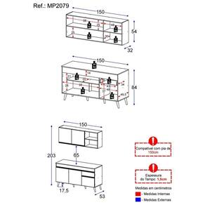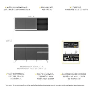 Altura: 203cm | Largura: 150cm | Profundidade: 32cm (aéreo) - 53cm (balcão com tampo)