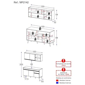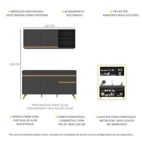 Dimensões do produto montado: Altura: 203cm | Largura: 150cm | Profundidade: 32cm (aéreo) - 53cm (balcão com tampo) *Você pode consultar as medidas internas na imagem técnica do produto.