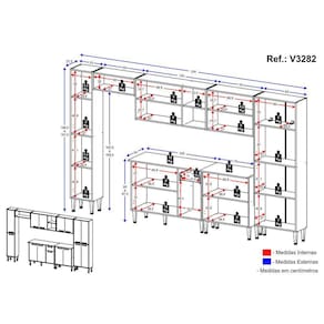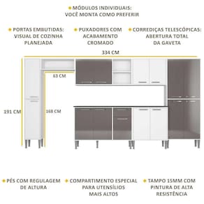 Dimensões do produto montado: Cozinha: Altura: 191 cm - Largura: 334 cm - Profundidade: 27,5 cm (aéreos e paneleiro) - 45 cm (balcão com tampo) Espaço do nicho para fogão/geladeira: Altura: 168 cm - Largura: 63 cm *Você pode consultar as medidas internas na imagem técnica do produto.