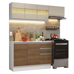Com fabricação feita 100% em MDF, material de grande resistência, esta cozinha garante durabilidade e qualidade. Os puxadores são em alumínio, as corrediças e dobradiças são metálicas e os pés são reguláveis em PVC, com rodapé removível em MDF.