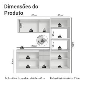 - 47cm de profundidade nos balcões e torre quente e 29cm nos aéreos