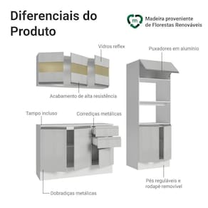 Conta com pés reguláveis e rodapés removíveis de fácil encaixe. O acabamento Branco Brilhante e as portas com vidro reflex valorizam ainda mais o ambiente.