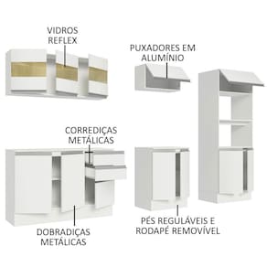 A fabricação é feita 100% em MDF, material ecologicamente correto e muito resistente. Possui ainda puxadores em alumínio, corrediças e dobradiças metálicas e pés reguláveis em PVC, detalhes que garantem maior conforto e praticidade.