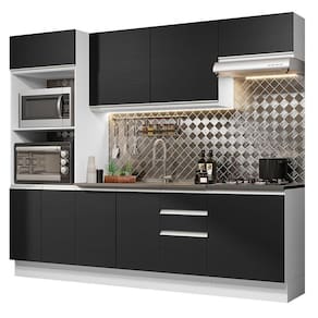 O acabamento é em Pintura Poliéster de alta resistência, processo que confere maior qualidade e durabilidade ao produto. A estrutura é em branco fosco e as portas e frentes das gavetas são em preto.