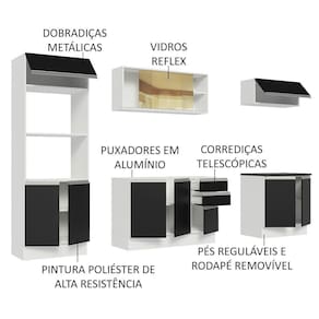 O acabamento da estrutura é branco fosco e as portas e frentes são em branco brilhante. É feito em Pintura Poliéster ecológica de alta resistência, que confere maior durabilidade e durabilidade ao móvel e oferece proteção contra os efeitos da água e do calor.