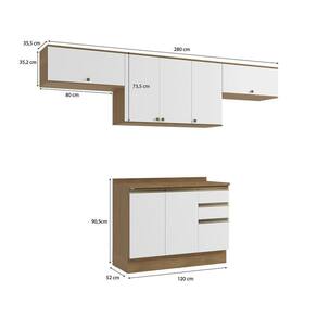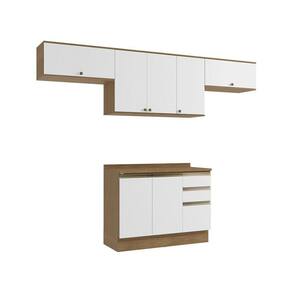 Acabamento: Pintura Brilho / Pintura Touch | Cor: Nogueira/Branco | Corrediças: Telescópicas | Dobradiça: Com Amortecimento / Sem Amortecimento | Garantia: 3 meses para defeito de fabricação | Matéria-prima: MDF / MDP | Peso suportado por cada gaveta: 6 Kg | Peso suportado por cada prateleira: 7 kg | Puxadores: Metálicos / Puxadores de Metal e de Alumínio | Quantidade de gavetas: 3 | Quantidade de portas: 1 / 3 | Quantidade de prateleiras: 1 / 2 | Sistema de montagem: Parafuso Philips | Tipo de porta: Bater | Duração da garantia: 3 meses | Tipo de garantia: Garantia do fabricante | Montagem: Necessita montagem | Tipo de móveis de cozinha: Combo de móveis de cozinha | Requer montagem: Sim