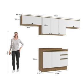 Uma combinação clássica e linda, perfeita para todos os ambientes e para quem não abre mão de sofisticação. Unindo o conforto do amadeirado e a luminosidade do branco brilho, você terá um ambiente confortável e aconchegante para preparar receitas e receber sua família e amigos. Compacto e funcional, perfeito para o estilo minimalista, o combo une o balcão de pia e três aéreos, sendo dois basculantes e um aéreo de pia, uma composição versátil e indispensável para quem procura por funcionalidade.