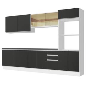 O acabamento da estrutura é branco fosco e as portas e frentes são em preto. É feito em Pintura Poliéster ecológica de alta resistência, que confere maior durabilidade e durabilidade ao móvel e oferece proteção contra os efeitos da água e do calor.