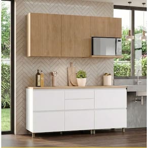 Armário De Cozinha Completa 100% Mdf 7 Portas 5 Gavetas Raissa Nesher Branco / Madeirado O armário de cozinha completa Raissa combina design moderno com alta funcionalidade. Produzido em 100% MDF, oferece durabilidade superior e excelente acabamento. As gavetas com corrediças telescópicas de 3 estágios proporcionam abertura total e deslizamento suave, incluindo uma gaveta porta-tempero e outra com organizador de talheres, garantindo praticidade no uso diário. O conjunto possui balcão de 70 cm com possibilidade de adaptação para cooktop e balcão de 120 cm para instalação de pia, permitindo maior versatilidade na montagem da sua cozinha. O armário aéreo conta com nicho exclusivo para micro-ondas, otimizando o espaço e mantendo os eletrodomésticos organizados. Suas portas equipadas com dobradiças Slow motion oferecem fechamento suave e silencioso. O design se destaca pelos detalhes canelados usinados no armário superior, que trazem um toque contemporâneo e sofisticado ao ambiente. Além disso, os pés reguláveis garantem estabilidade e fácil limpeza. Com amplo espaço interno, este armário é ideal para quem busca organização, beleza e eficiência em um só produto. MEDIDAS ARMÁRIO: A = 228 cm (com pés) L = 190 cm P = 52 cm ALTURA PÉS: A = 10 cm PRATELEIRAS SUPORTAM ATÉ: 15 kg GAVETAS SUPORTAM ATÉ: 10 kg NICHO SUPORTA ATÉ: 20 kg TAMPO SUPORTA ATÉ: 30 kg PESO SUPORTADO: 195 kg PESO: 147 kg MODELO: Armário De Cozinha Completa 100% MDF 7 Portas 5 Gavetas Raissa Nesher MARCA: Nesher MATERIAL: MDF ESPESSURA DO MATERIAL: 15 mm PINTURA: UV de alta qualidade ACABAMENTO: Fosco PORTAS: 7 TIPO DE PORTA: Bater / Basculantes DOBRADIÇAS: Slow Motion PISTÃO A GÁS: Sim PRATELEIRAS: 7 NICHOS: 1 GAVETAS: 5 CORREDIÇAS: Telescópicas (3 estágios) PUXADORES: Cava MATERIAL DO TAMPO: MDF ESPESSURA DO TAMPO: 30 mm PÉS: 9 (reguláveis) MATERIAL DOS PÉS: Plástico SISTEMA DE MONTAGEM: Parafusos, minifix e cavilhas DIFERENCIAIS: Estrutura 100% MDF / Detalhes canelados usinados / Gaveta com porta talheres e porta tempero embutidos / Amplo espaço para melhor armazenamento / Corrediças telescópicas 3 estágios / Dobradiças Slow motion / Pistão a gás / Pés reguláveis / Balcões com possivel adaptação para cooktop e pia. INSTRUÇÕES E CUIDADOS: Para maior durabilidade, recomendável que a limpeza dos móveis seja feita com pano limpo e seco. Não usar produtos químicos ou abrasivos GARANTIA: 3 meses pelo fabricante.