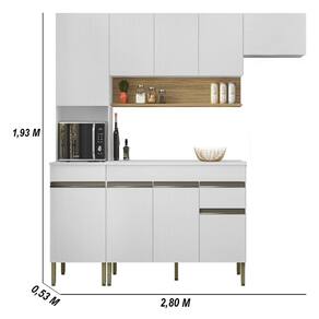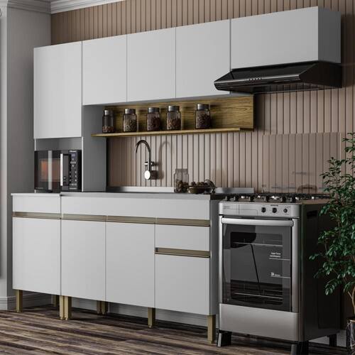 Conheça Cozinha Madrid 1.5 que une praticidade e estilo. Fabricada com MDP de 15 mm, oferece durabilidade e possibilidade para instalar uma pia. Com nove portas, uma gaveta e prateleiras internas espaçosas, garante excelente organização. O passa-fios mantém seus cabos organizados, e as dobradiças e corrediças metálicas oferecem movimento suave. Seus pés reguláveis garantem estabilidade em qualquer piso. O acabamento de alta qualidade, com pintura sensível ao toque e secagem UV, oferece sofisticação e resistência.
