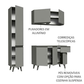 A fabricação segue padrões de alta qualidade, utilizando materiais nobres e resistentes. Os puxadores são em alumínio na cor titanium, as corrediças são telescópicas para abertura total da gaveta e as dobradiças são metálicas nas portas.