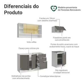 O acabamento de alta resistência da estrutura é em Branco, das frentes em Cinza e possui uma textura suave ao toque. O destaque fica por conta dos puxadores ponto em ouro envelhecido, feitos com metal resistente, trazem personalidade e um charme único. Outro diferencial está no detalhe chanfrado das frentes, que forma molduras elegantes e dá profundidade ao design.