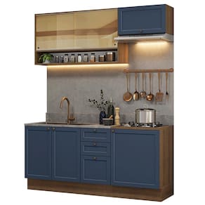 O acabamento de alta resistência da estrutura é em tom amadeirado Rustic, das frentes em Azul e possui uma textura suave ao toque. O destaque fica por conta dos puxadores ponto em ouro envelhecido, feitos com metal resistente, trazem personalidade e um charme único. Outro diferencial está no detalhe chanfrado das frentes, que forma molduras elegantes e dá profundidade ao design.