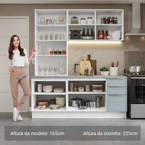 Fabricada com alto padrão de qualidade, a cozinha conta com vidro incolor sobreposto nas frentes e portas, puxadores em alumínio, gavetas com corrediças telescópicas de abertura total, portas com amortecimento para fechamento suave e pés reguláveis em PVC.