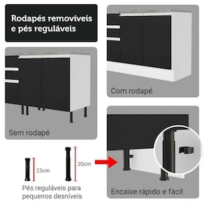 Composto por itens de muita qualidade, possui puxadores em alumínio, gavetas com corrediças telescópicas de abertura total, portas com amortecimento para fechamento suave e pés reguláveis em PVC.