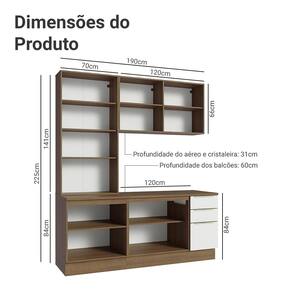 - 60 cm de profundidade nos balcões e 31 cm no aéreo e na cristaleira