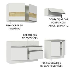 Os materiais utilizados na fabricação são de qualidade superior. Conta com puxadores em alumínio, corrediças telescópicas na gaveta, amortecedores para fechamento suave das portas e pistão a gás na porta basculante. Além disso, possui pés reguláveis em PVC e rodapé removível em MDP.