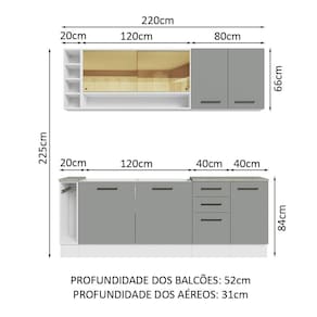 - 52 cm de profundidade nos módulos inferiores e 31 cm nos aéreos