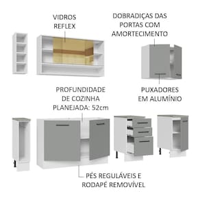 Qualidade não vai faltar na sua cozinha, já que este armário possui puxadores com alça em alumínio, gavetas com corrediças telescópicas de abertura total, portas com amortecimento para fechamento suave, vidro reflex no aéreo e pés reguláveis em PVC.