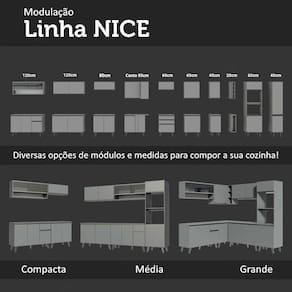 Composto por materiais resistentes e de qualidade superior, este conjunto conta com puxadores em alumínio, corrediças telescópicas para abertura total das gavetas e dobradiças metálicas nas portas.