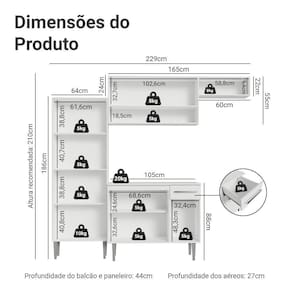 - 44 cm de profundidade no balcão e paneleiro e 27 cm nos aéreos