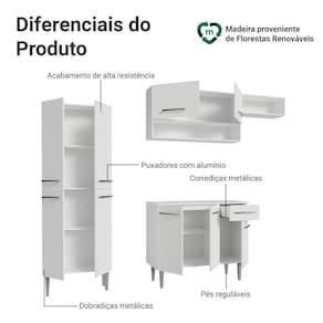 Entre os diferenciais estão o acabamento de alta resistência, que garante maior durabilidade, os puxadores em alumínio, além das dobradiças e corrediças metálicas, que proporcionam mais firmeza no uso. Os pés reguláveis completam o conjunto, garantindo mais estabilidade e facilitando a limpeza do ambiente.