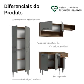 Entre os diferenciais estão o acabamento de alta resistência, que garante maior durabilidade, os puxadores em alumínio, além das dobradiças e corrediças metálicas, que proporcionam mais firmeza no uso. Os pés reguláveis completam o conjunto, garantindo mais estabilidade e facilitando a limpeza do ambiente.