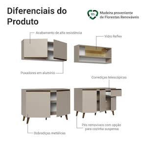 Produzido com materiais de qualidade, o balcão conta com dobradiças metálicas nas portas e puxadores em perfil de alumínio, discretos e resistentes. O tampo é removível, o que permite a instalação de cuba ou pedra. O acabamento é de alta resistência, garantindo durabilidade no uso diário.
