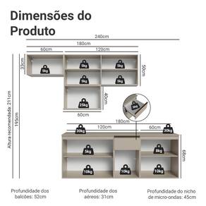 - 52 cm de profundidade nos balcões, 31 cm nos aéreos e 45 cm no nicho de micro-ondas