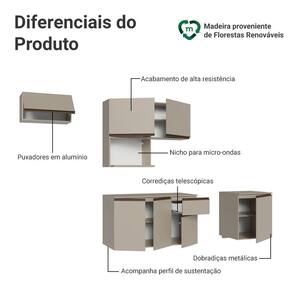 Produzido com materiais de qualidade, o balcão conta com dobradiças metálicas nas portas e puxadores em perfil de alumínio, discretos e resistentes. As gavetas possuem corrediças que permitem abertura total. O tampo é removível, possibilitando a instalação de cuba ou pedra e o acabamento é de alta resistência, garantindo durabilidade.