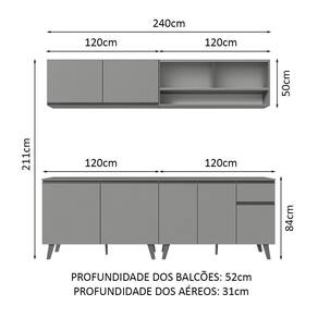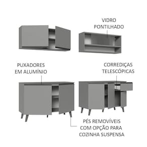 O acabamento da cozinha é cinza, feito em Pintura Poliéster ecológica, que oferece proteção contra os efeitos da água e do calor.