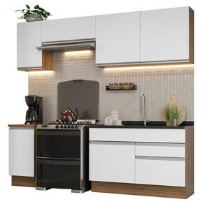 Para completar, o acabamento da cozinha é no padrão amadeirado Rustic e as portas e frentes são brancas. Feito em Pintura Poliéster ecológica, que consiste na aplicação de 7 camadas de proteção resistentes a álcool, água e calor.