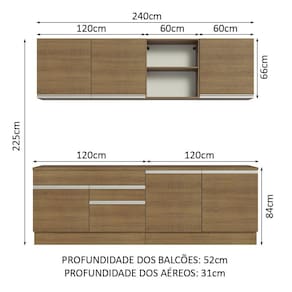 O espaço interno e externo é ótimo para a organização de todos os utensílios, louças e objetos de decoração. Além disso, ambos os balcões acompanham tampo. Mas, caso você deseje, é possível fazer a colocação de pias de inox ou pedra, na medida de 120 x 52 cm.