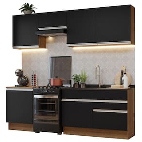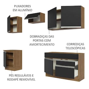 A fabricação é feita com materiais de qualidade, como corrediças telescópicas, puxadores com perfil total em alumínio, dobradiças com amortecimento e pés reguláveis em PVC, com rodapé removível em MDP.