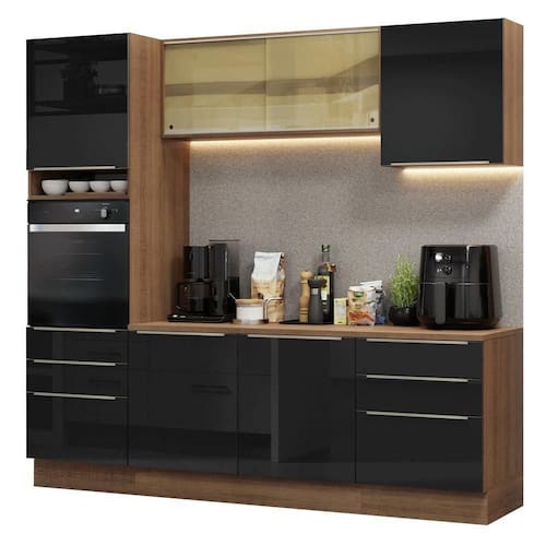COR: Preto | Garantia: 3 meses contra de fabricação | Dimensões - Altura: 225 cm | Dimensões - Largura: 240 cm | Dimensões - Profundidade: 60 cm | Produto: Cozinha Completa | Marca: Madesa | Peso aproximado: 189 kg | Material: MDP | Estado de Origem: RS | Conteúdo da embalagem: 1 Cozinha Completa | Material para Filtro: MDP | Instruções/Cuidados: Utilize um pano limpo, levemente umedecido e seque em seguida a superfície. Não usar produtos químicos ou abrasivos para a limpeza. Recomendamos polir seu móvel com lustra-móveis duas a três vezes por ano. | Produto precisa de Montagem?: Sim | Inclui tampo: Sim | Peso Produto Com Embalagem (Kg): 203,3 | Altura do Produto com Embalagem (cm): 97,3 | Largura Produto Com Embalagem (cm): 66 | Comprimento Produto Com Embalagem (cm): 214,3 | Descrição do Tamanho: 225 cm x 240 cm x 60 cm | Nome do Simples no Fornecedor: Armário de Cozinha Completa 240cm Rustic/Preto Lux Madesa 08 | Fabricante: Madesa | do Fabricante: | RBN: Casa/Móveis/Móveis de Cozinha | Quantidade de Gavetas: 6 | Tipo de Pé: Regulavel | Cômodo Indicado: Cozinhas | Quantidade de portas: 6 | Quantidade de caixas de embalagem: 14 | Bullet Point 0: Dimensões: 225 cm altura x 240 cm largura x 60 cm profundidade | Bullet Point 1: As portas e gavetas que recebem um vidro preto aplicado, detalhe que traz muita beleza ao ambiente | Bullet Point 2: Com ótimo espaço interno, possui profundidade de cozinha planejada com 60 cm | Bullet Point 3: Possui acabamento de alta resistência, conservando a beleza do móvel por muito mais tempo | É Frágil: Não | Quantidade de Itens: 1 | Certificação de teste externa: Sim | Modelo: GRLX2400087K | Componentes incluídos: Portas | Precisa de baterias ou pilhas: Não | da peça: GRLX2400087K | Tipos de Móveis de Cozinha: Cozinha Completa | Cor: Rustic/Preto