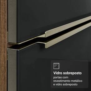 As portas e gavetas que recebem um vidro preto aplicado, detalhe que traz muita beleza ao ambiente. Já as portas de correr de vidro reflex podem mostrar o interior do móvel ou refletir o espaço, variando conforme a luz do ambiente, trazendo ainda mais elegância.