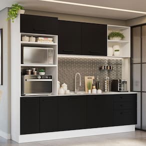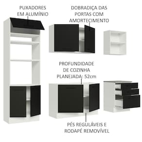 Para completar, a organização de todos os itens da cozinha vai ficar mais fácil, já que o móvel conta com diversas gavetas, prateleiras e nichos. A torre oferece espaço para forno e micro-ondas e o balcão maior tem espaço para pia de inox ou pedra, nas medidas de 120 x 52 cm.