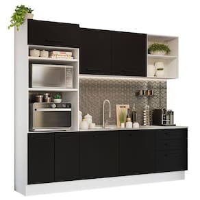 O acabamento da estrutura é branco e o das portas e frentes é preto. É feito em Pintura Poliéster ecológica com sete camadas, que destaca a tonalidade e protege o móvel.