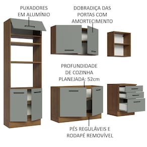 Para completar, a organização de todos os itens da cozinha vai ficar mais fácil, já que o móvel conta com diversas gavetas, prateleiras e nichos. A torre oferece espaço para forno e micro-ondas e o balcão maior tem espaço para pia de inox ou pedra, nas medidas de 120 x 52 cm.