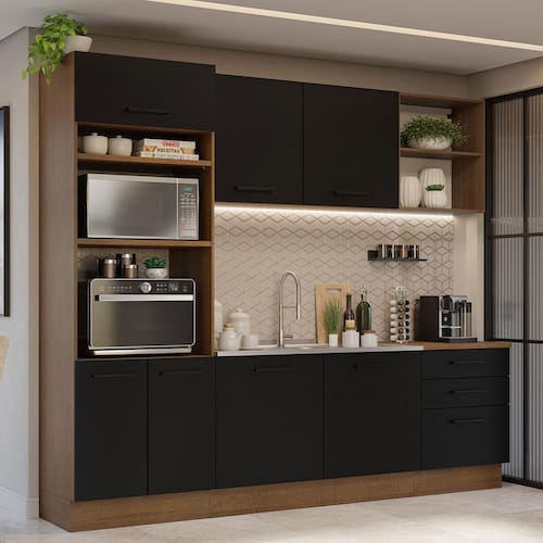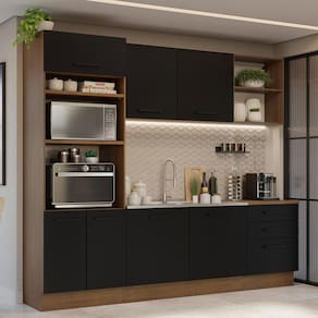 Para completar, a organização de todos os itens da cozinha vai ficar mais fácil, já que o móvel conta com diversas gavetas, prateleiras e nichos. A torre oferece espaço para forno e micro-ondas e o balcão maior tem espaço para pia de inox ou pedra, nas medidas de 120 x 52 cm.