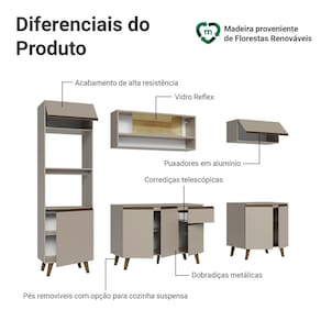 Produzido com materiais de qualidade, os balcões contam com dobradiças metálicas nas portas e puxadores em perfil de alumínio, discretos e resistentes. O tampo é removível, o que permite a instalação de cuba, pedra ou cooktop. O acabamento é de alta resistência, garantindo durabilidade no uso diário.