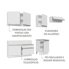 A fabricação é feita com materiais de qualidade, como corrediças telescópicas, puxadores com perfil total em alumínio, dobradiças com amortecimento e pés reguláveis em PVC, com rodapé removível em MDP.